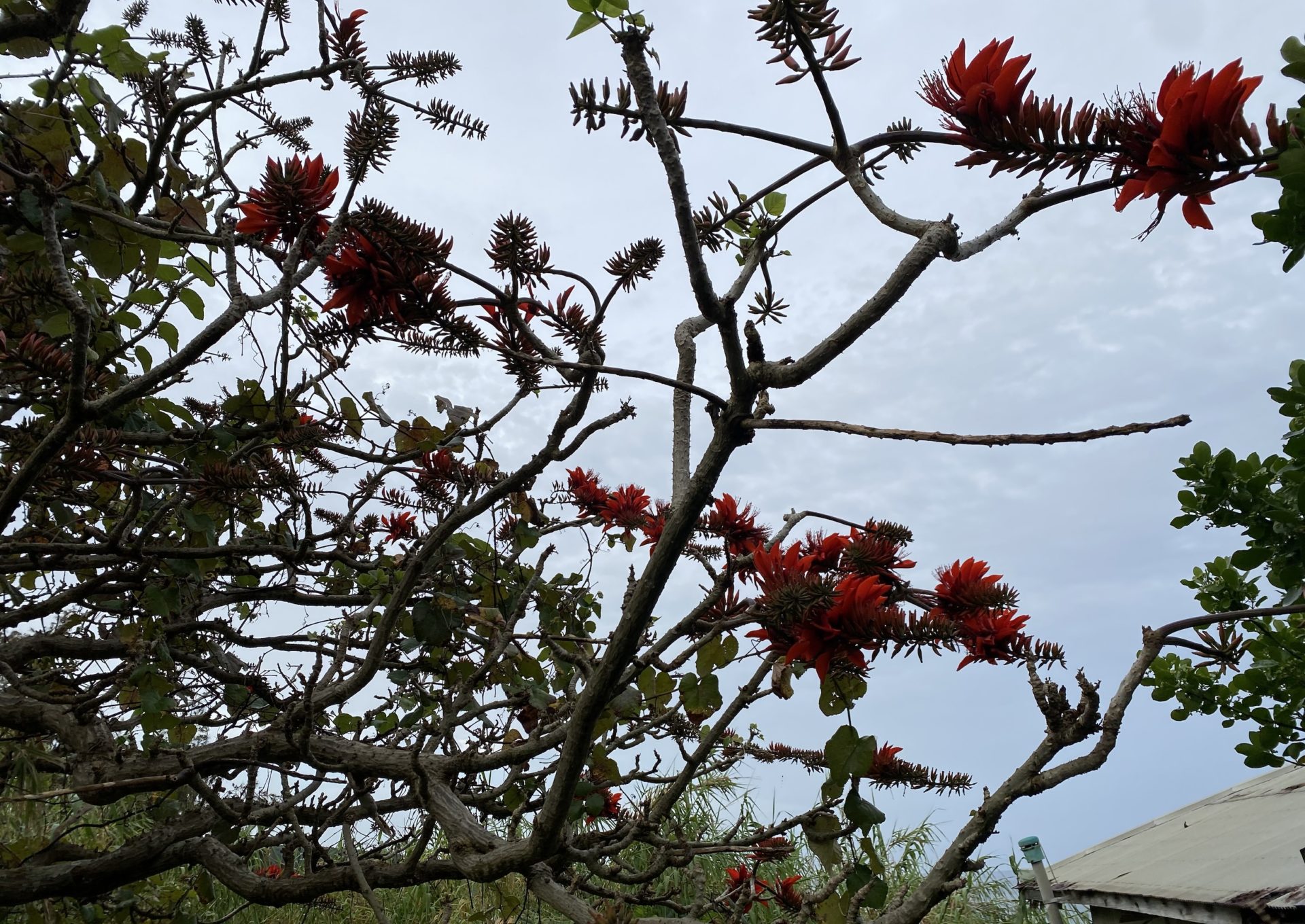 それはデイゴの花である。夕方で曇り空だったため、写真が暗くなってしまったのは申し訳ないが、鮮やかな赤色がとても魅力的である。